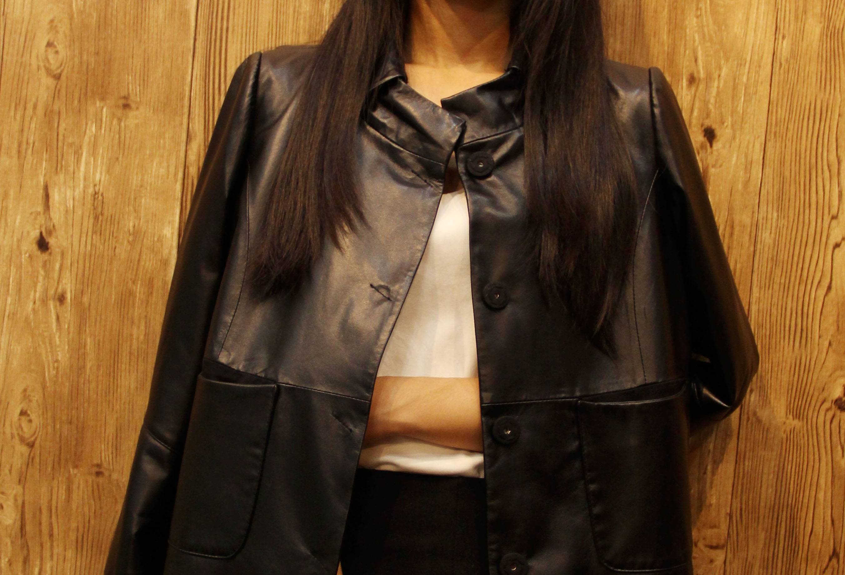 妍狐 黑色立领休闲气质皮衣